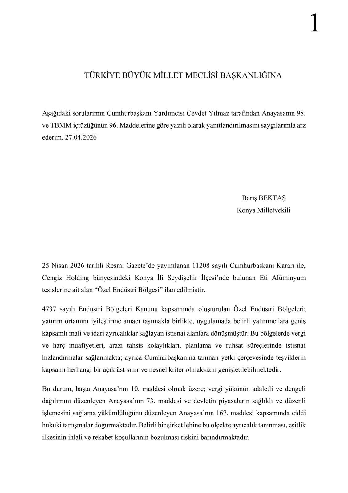 Konya’nın Seydişehir ilçesinde bulunan Eti Alüminyum tesislerinin yer aldığı alanın “Özel Endüstri Bölgesi” ilan edilmesi, Konya Milletvekili Barış Bektaş tarafından Türkiye Büyük Millet Meclisi gündemine taşındı. Bektaş, kararın tüm yönleriyle açıklığa kavuşturulması için yazılı soru önergesi sundu.