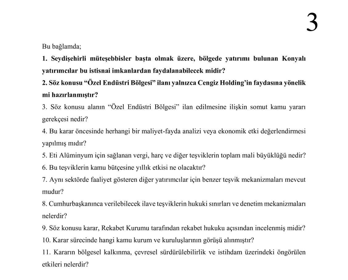 Barış Bektaş, Seydişehir’deki özel endüstri bölgesi kararı için 11 soruluk önerge verdi.