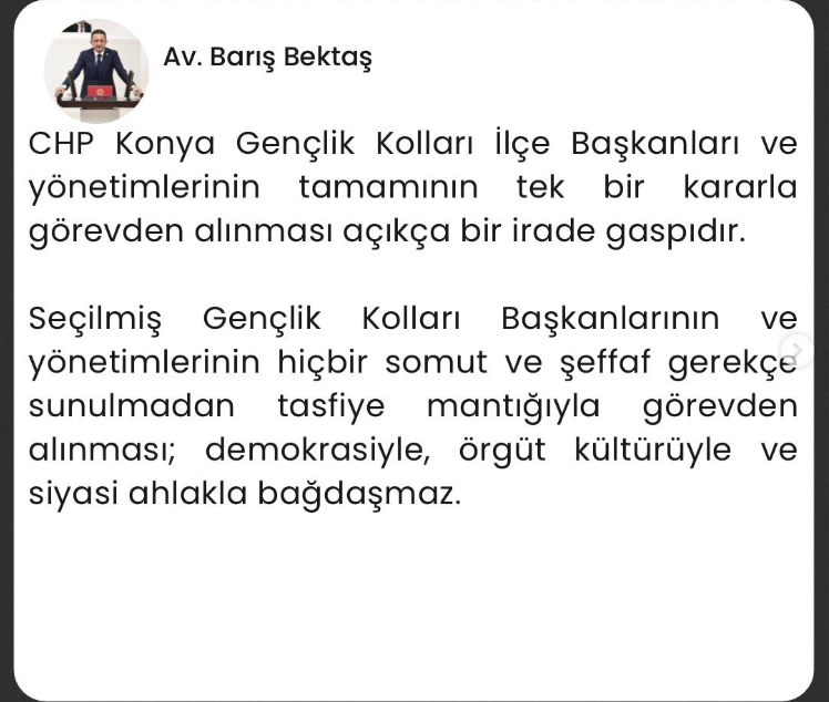 CHP Konya Milletvekili Av. Barış Bektaş’tan CHP Konya Gençlik Kolları Kararına Sert Tepki!