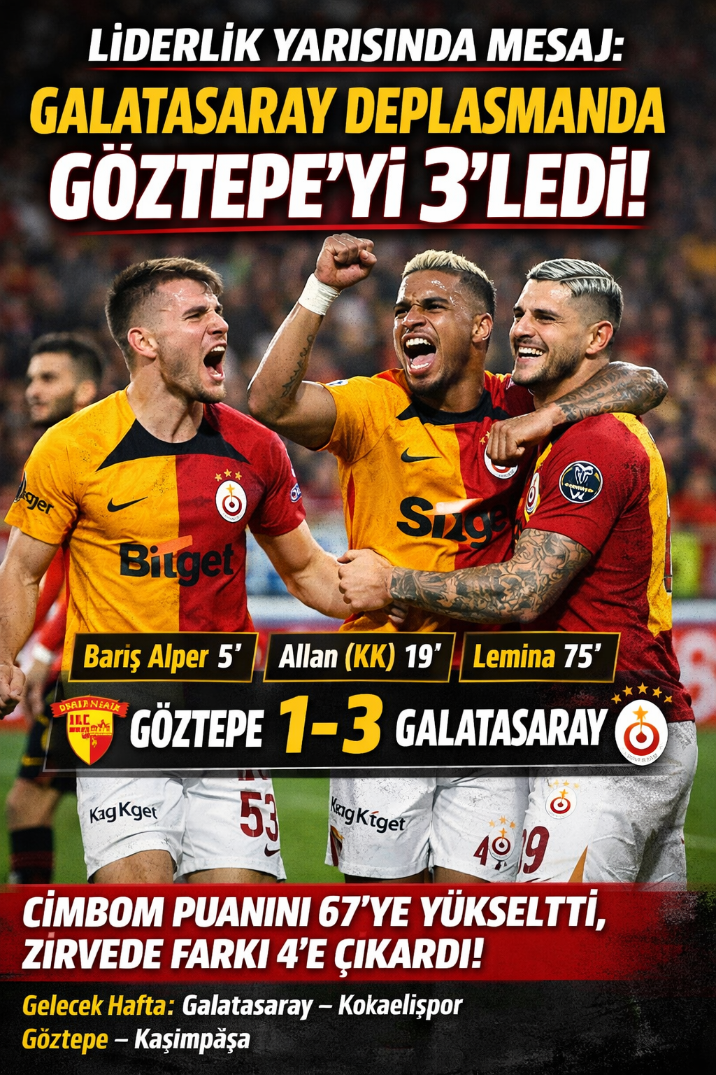 Galatasaray, Göztepe deplasmanında 3-1 kazanarak puanını 67’ye çıkardı ve Süper Lig’de liderliğini 4 puan farkla sürdürdü.
