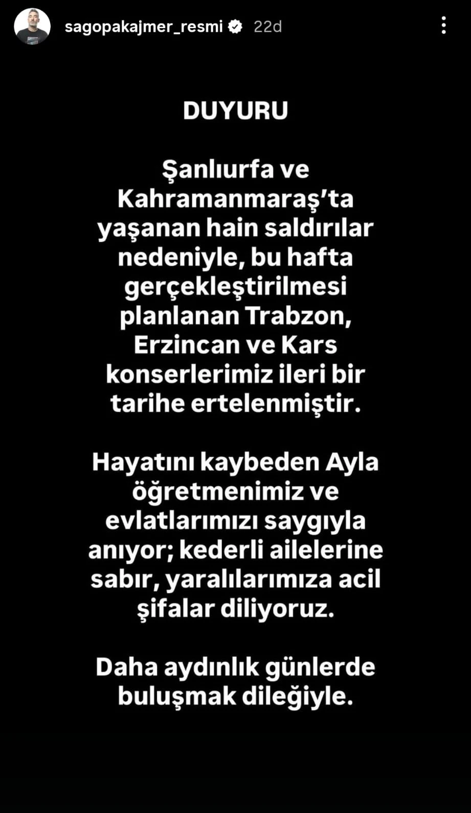 Edinilen bilgilere göre Sagopa Kajmer, Şanlıurfa ve Kahramanmaraş’ta yaşanan saldırılar nedeniyle bu hafta gerçekleştirilmesi planlanan Trabzon, Erzincan ve Kars konserlerinin ileri bir tarihe alındığını açıkladı.